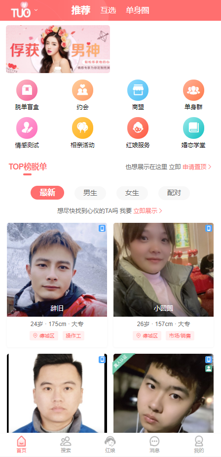 婚戀APP介紹婚戀交友APP主要功能:【異性推薦】精zhun條件搜索,智能雙向匹配,輕松約到稱心如意的對象【精zhun匹配】--根據您的資料,推薦匹配異性【會員豐富】--上億單身男女,在線尋找有緣人【紅娘服務】--您身邊的貼身婚戀專家,相親就靠她【安全可靠】--嚴格身份核查,真人照片,真實資料【免費通話】通過“密號”與心儀異性通話,...